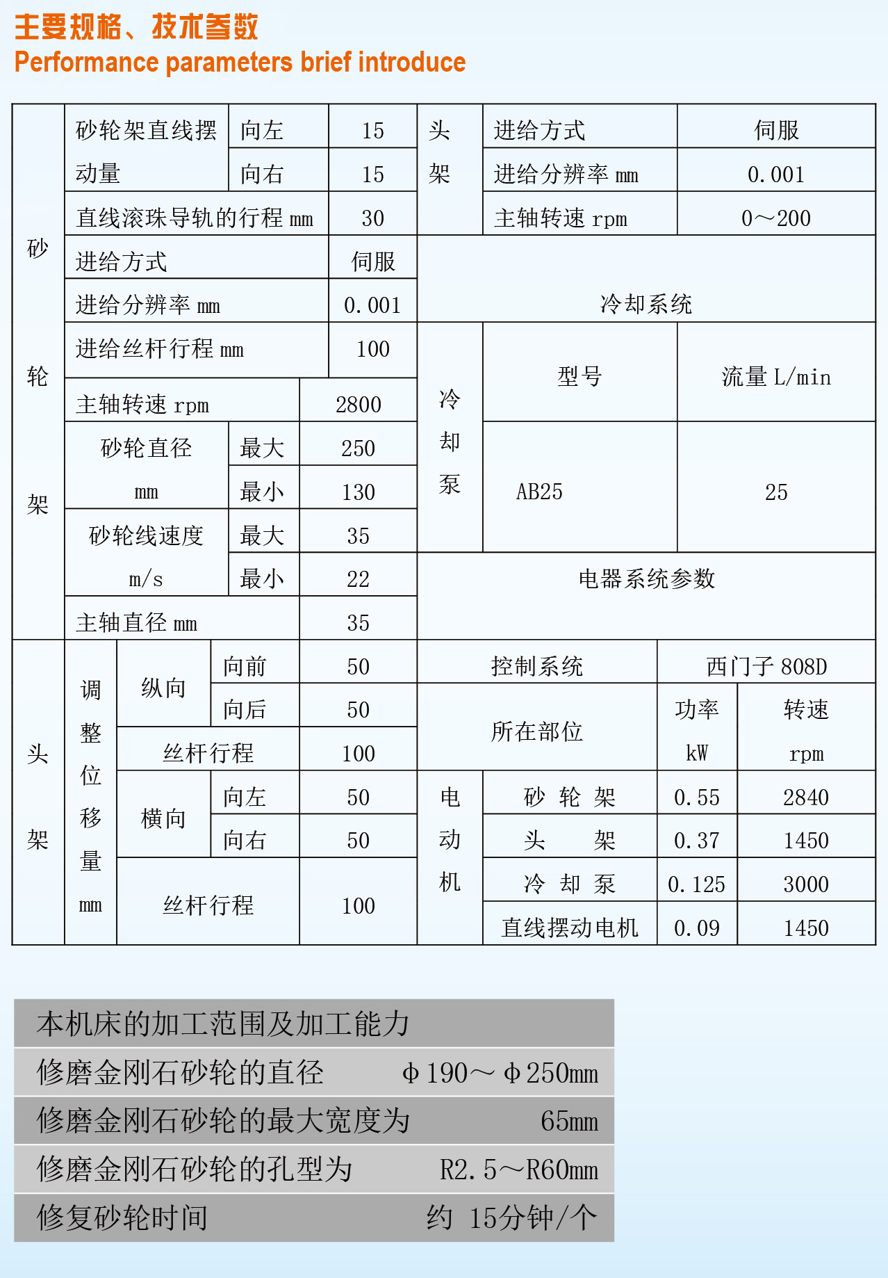 8)、控制系统采用西门子808D系统,控制轴数4轴,各进给轴移动由同服电机及电子手轮控制,内置固化的金刚石砂轮修整工艺程序,只需选择对应修整功能,输入对应加工参数,即可实现金刚石砂轮修整操作